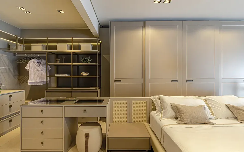 É comum que o closet feminino esteja integrado ou próximo a uma penteadeira, prevendo apoio para maquiagem, cuidados pessoais e uso de ferramentas térmicas, como secador e babyliss.