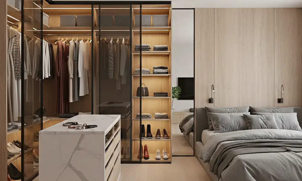 O uso de vidro e alumínio é cada vez mais comum em closets planejados, especialmente em portas, divisórias e detalhes decorativos. Esses materiais contribuem para leveza visual, precisão de acabamento e melhor integração com o dormitório.