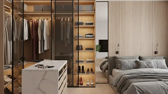 A combinação entre transparência e fechamento cria equilíbrio entre estética, praticidade e proteção das peças, adaptando o closet a diferentes rotinas e níveis de organização