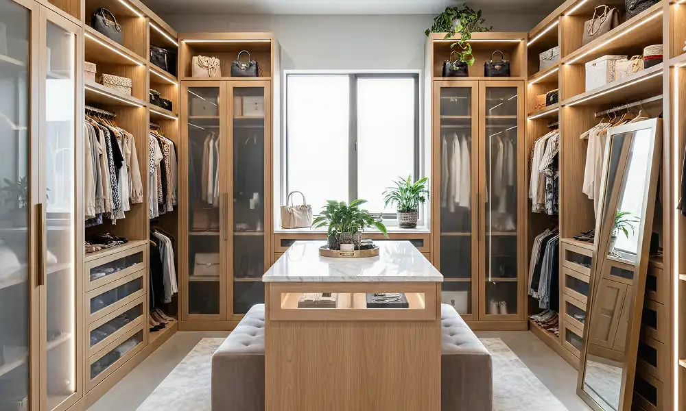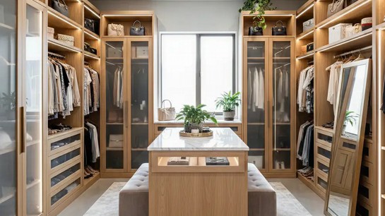 O closet em madeira clara transmite leveza, amplia visualmente o ambiente e funciona bem em espaços pequenos ou com iluminação natural limitada. É uma escolha frequente em projetos contemporâneos e em closets integrados ao dormitório.