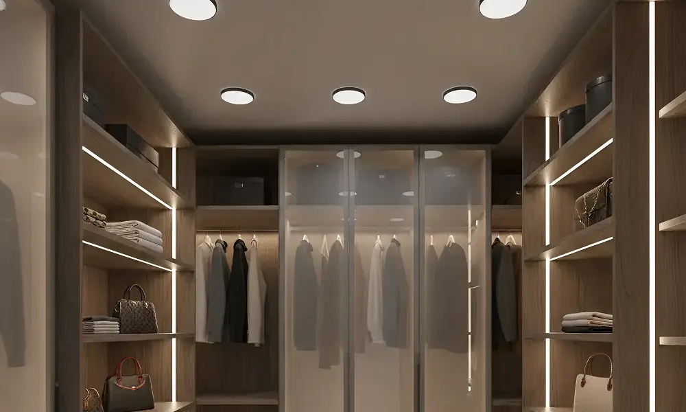 Quando integrada a prateleiras, gavetas e cabideiros, a iluminação elimina sombras internas e melhora significativamente a experiência de uso. Em projetos residenciais, costuma-se trabalhar com temperaturas de cor entre 3000K e 4000K, equilibrando conforto e fidelidade das cores das roupas.