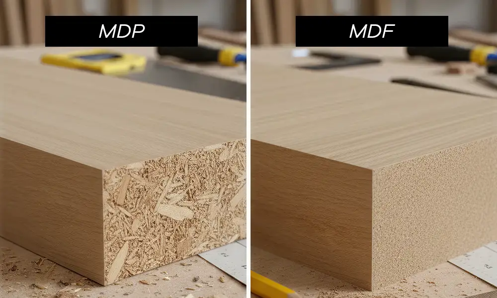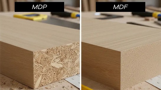 O MDP é mais comum em estruturas internas e módulos retos, oferecendo boa resistência mecânica e custo mais controlado. Quando bem especificado, funciona adequadamente em prateleiras, laterais e divisórias internas.